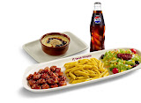 Tüm menüler, özel soslarla marine edilmiş tavuklar ve yanında makarna, patates veya pilav seçenekleriyle sunulur.